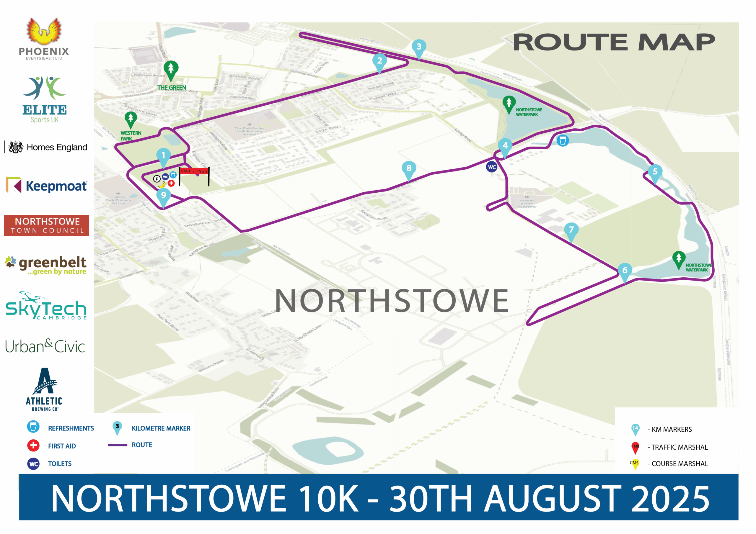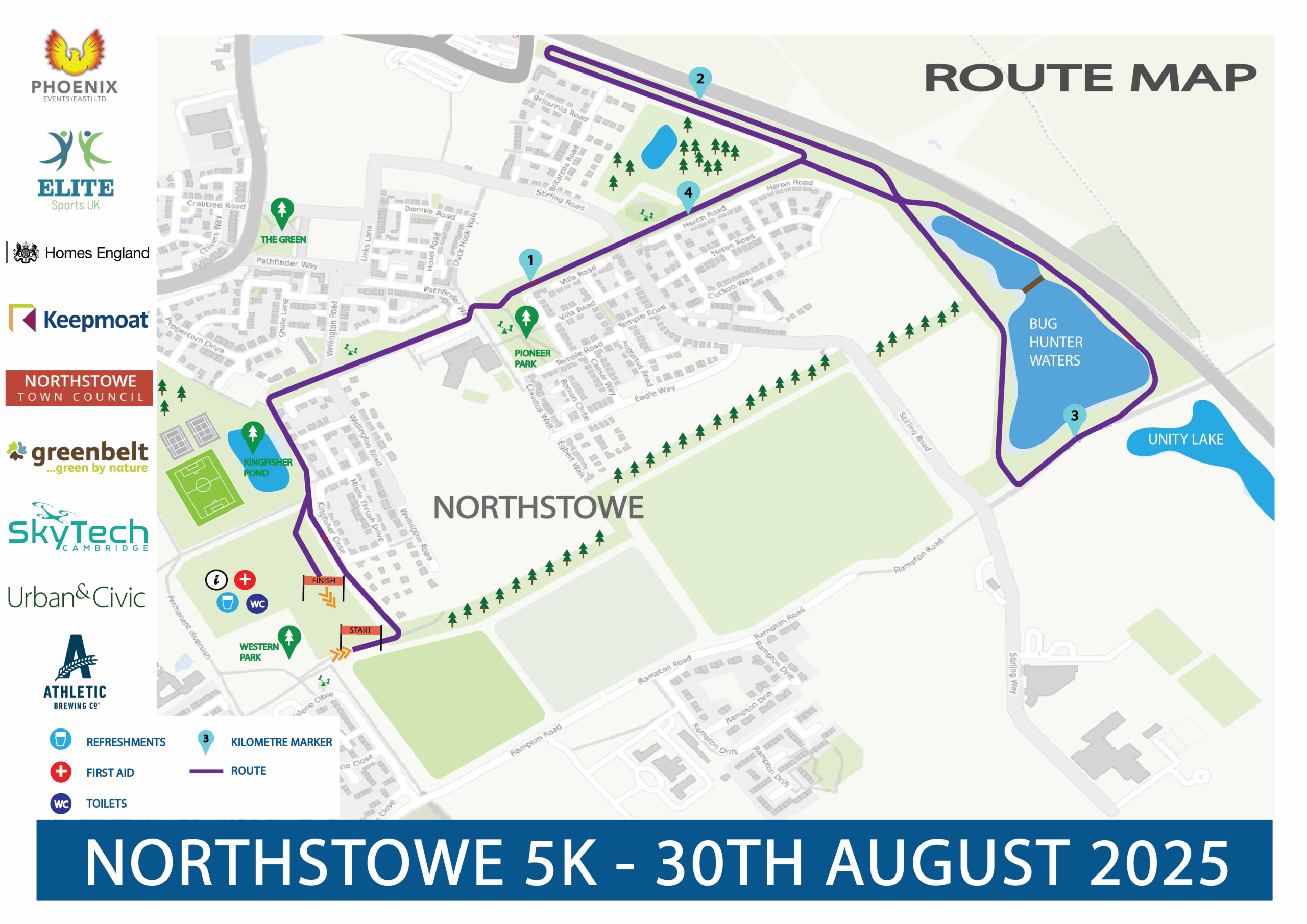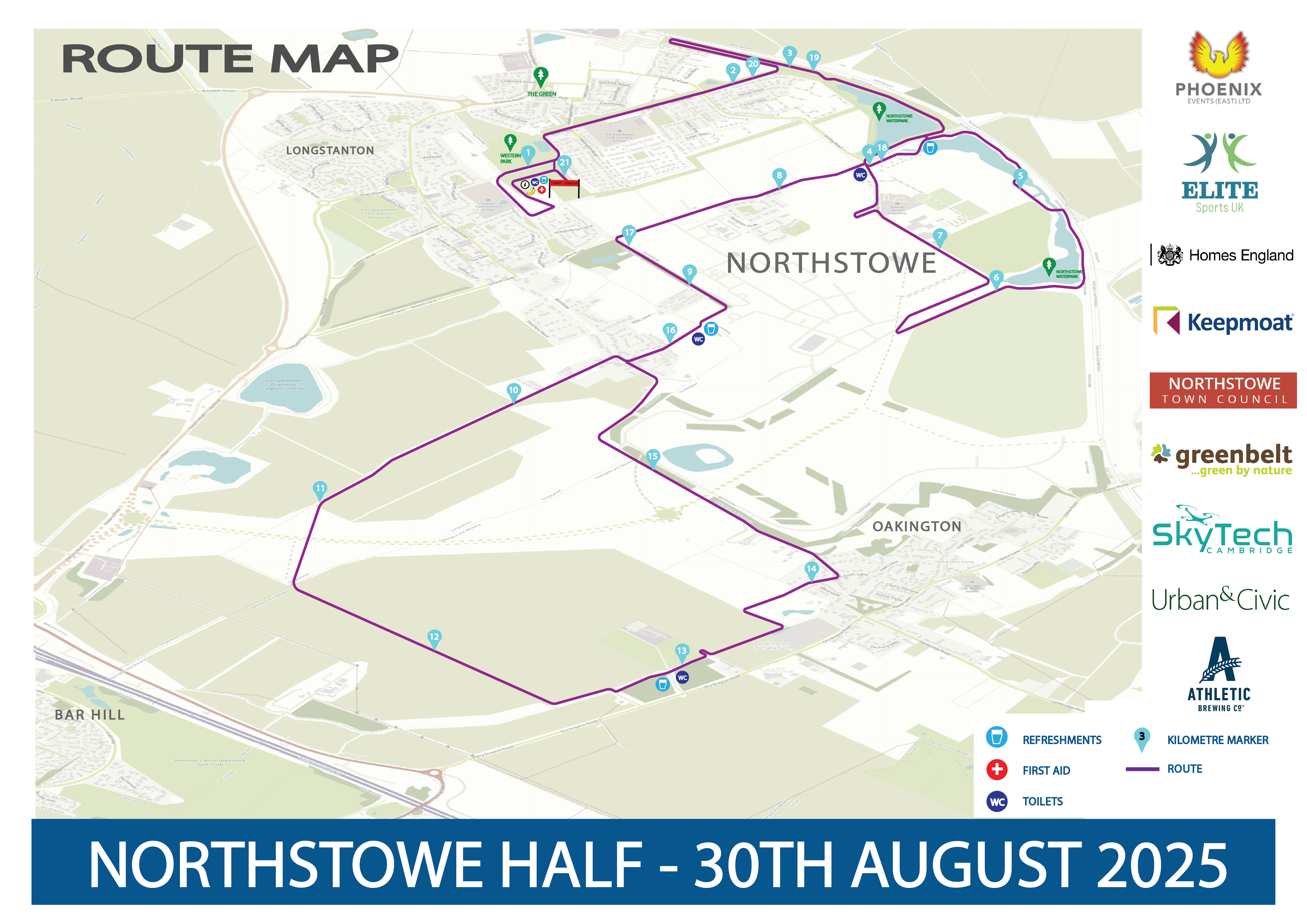 This very flat multi-terrain course will take you from the new developments of modern Northstowe Town, via peaceful paths around the Northstowe Water Park lakes and out past some of neighbouring Longstanton’s historic landmarks into the surrounding countryside with its open skies and expansive natural vistas before coming back to the finish line at Western Park and the runners’ village packed with free entertainment and a delicious street food market.